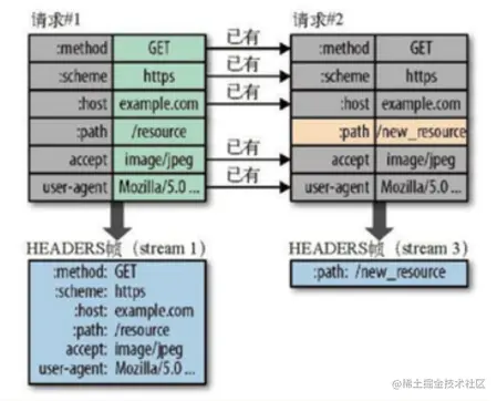 例如:下图中的两个请求, 请求一发送了所有的头部字段,第二个请求则只需要发送差异数据,这样可以减少冗余数据,降低开销