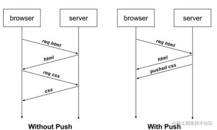 服务器会顺便把一些客户端需要的资源一起推送到客户端,如在响应一个页面请求中,就可以随同页面的其它资源