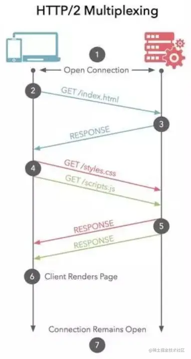 HTTP/2 复用TCP连接,在一个连接里,客户端和浏览器都可以同时发送多个请求或回应,而且不用按照顺序一一对应,这样就避免了”队头堵塞”