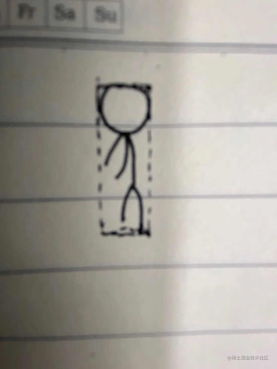 我们绘制的点线面节点都可以计算出包围盒,比如下面的小人的虚线框: