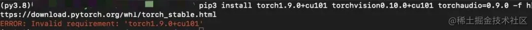 pip3 install torch1.9.0+cu101 torchvision0.10.0+cu101 torchaudio=0.9.0 -f