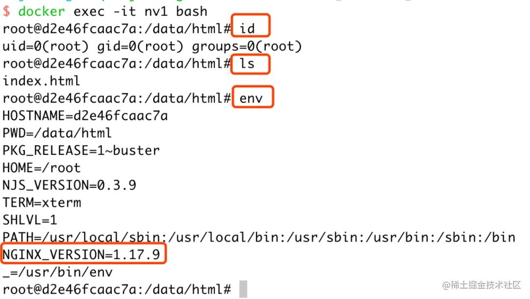 进入容器后,默认会切换到 /data/html 目录,这个是 WORKDIR 指令指定的目录。 可以使用 id 命令查看当前用户信息,显示为 root。这个是 USER 指令指定的用户。 使用 ls 命令来查看当前目录的文件,会看到 index.html 文件,这个是 COPY 指令复制到容器的文件。 使用 env 命令可以查看当前环境下有一个变量 NGINX_VERSION=1.17.9 这个是 ENV 指令指定的信息。