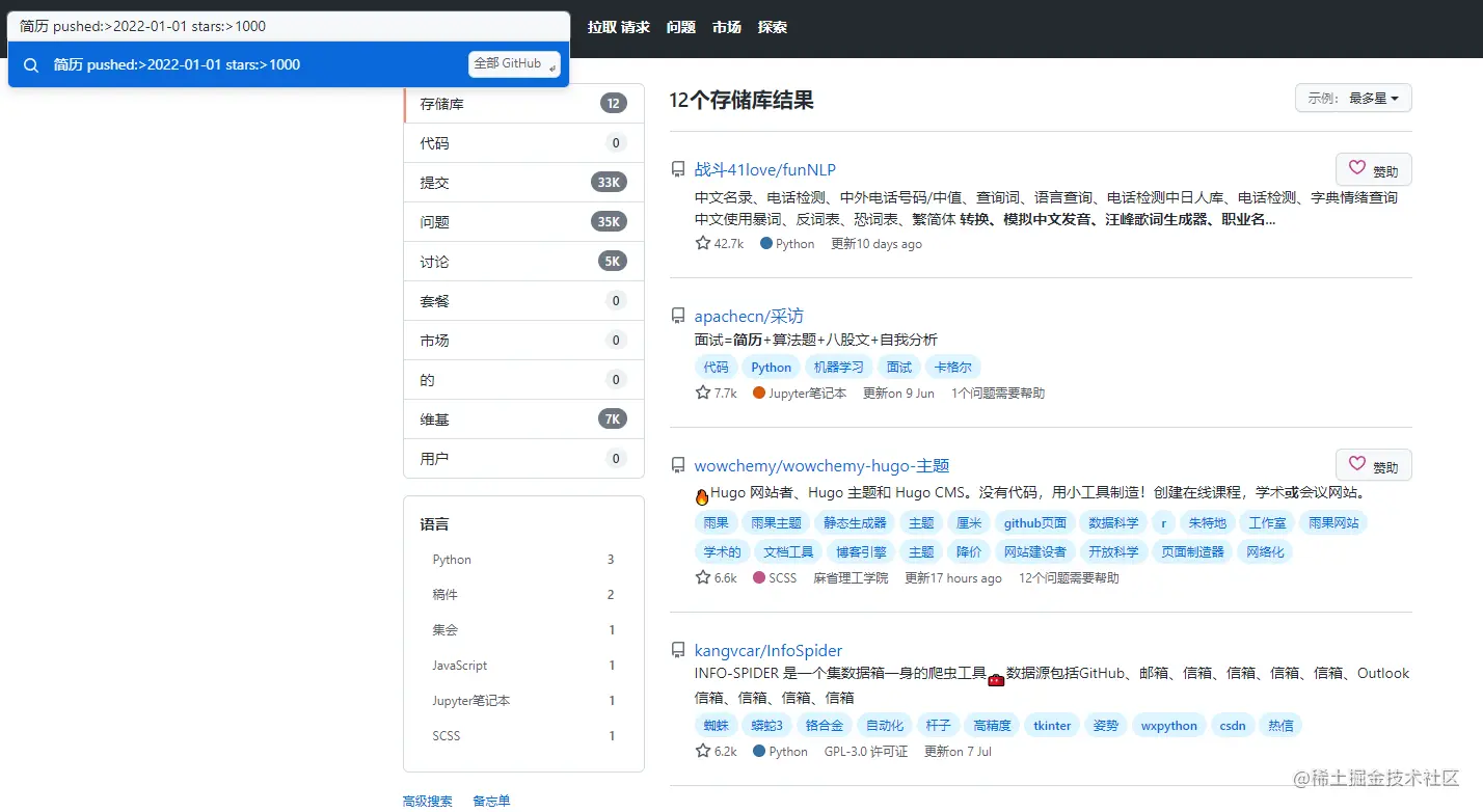 除了搜索仓库 还能搜索主题、代码、提交情况请参考# 在 GitHub 上搜索