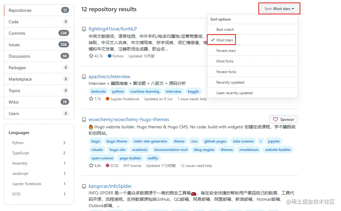 stars数量多得排在前面