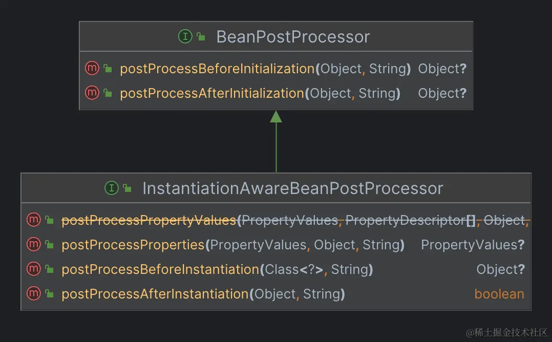 可以看到,它其实是一个继承了 BeanPostProcessor 的接口,并在 BeanPostProcessor 的基础上添加了几个方法。