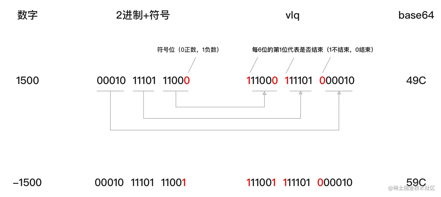 看到这里就会有小伙伴问,为啥vlq编码能去除负号和分隔符呢?实际上vlq编码的二进制形式就预留了符号位和连续标识位来表示负数和分隔符。