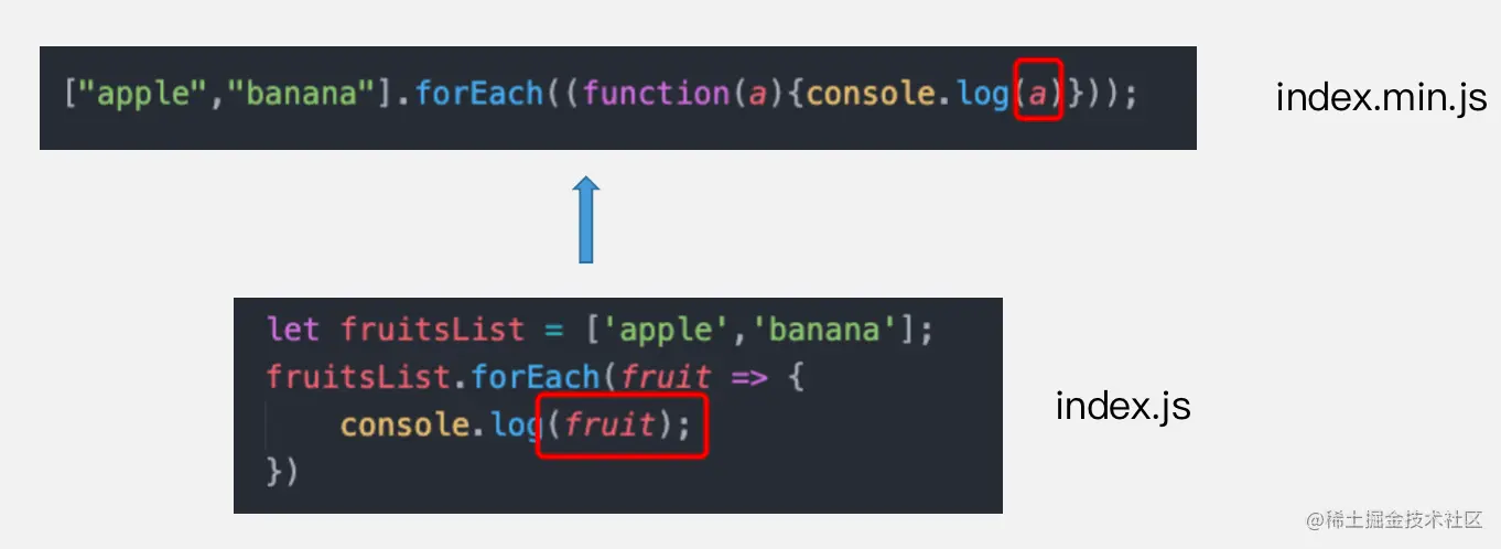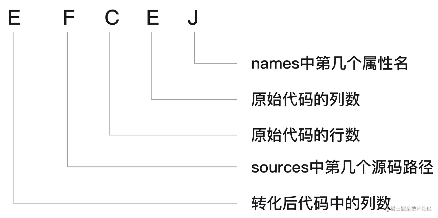 上图中,index.js压缩后的代码为index.min.js。红框中的fruit变量在压缩后变为a变量,那么两者的位置信息是转化后代码的第1行、第53列对应index.js的第5行、第17列的fruit变量。那么接下我们把这些信息转化为mappings中的第三层。