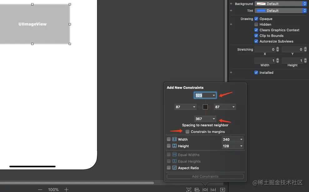 选择View选项再把四边距离设置为0就可以把imageview铺满了。