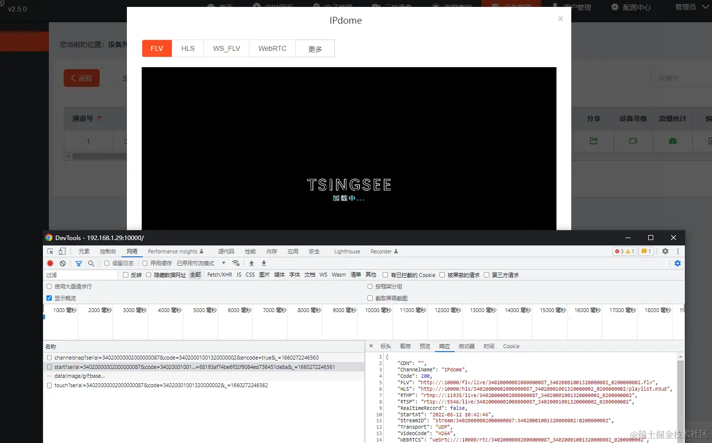 打开F12查看,原来是接口返回流地址并未携带IP,播放流地址错误导致无法播放,如图: