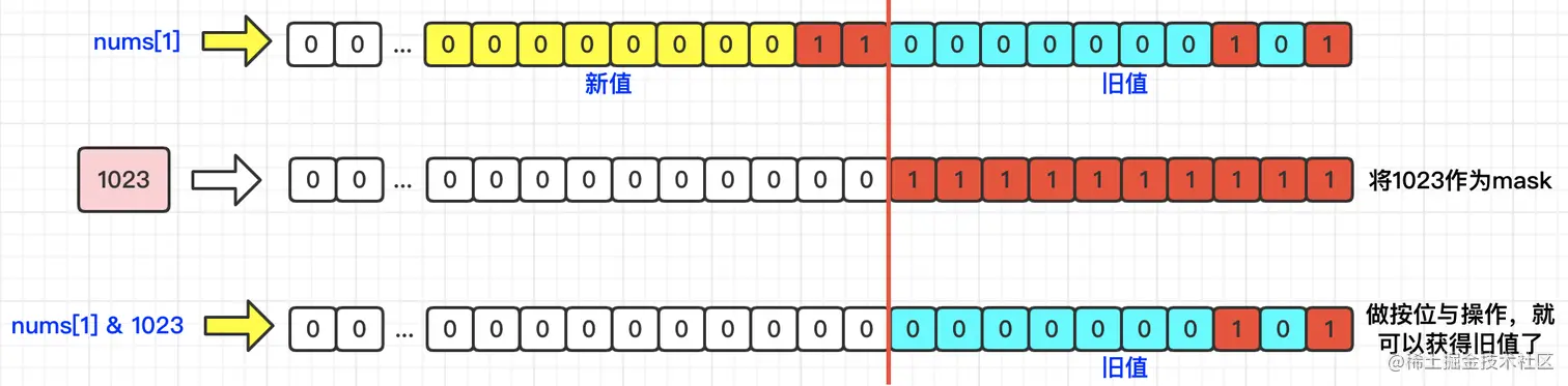 细心的同学会发现,上面的逻辑好像有问题吧,如果我们要将num[1]的值赋值给别的位置呢?此时的num[1]可是包含了新值和旧值了,那么这样不就有问题了吗?是这样的。所以,此时我们就需要1023这个值(低10位都是1)来获得nums[1]中的旧值了,具体来说,可以采用**按位与(&)**的方式,就可以了。具体如下图所示:
