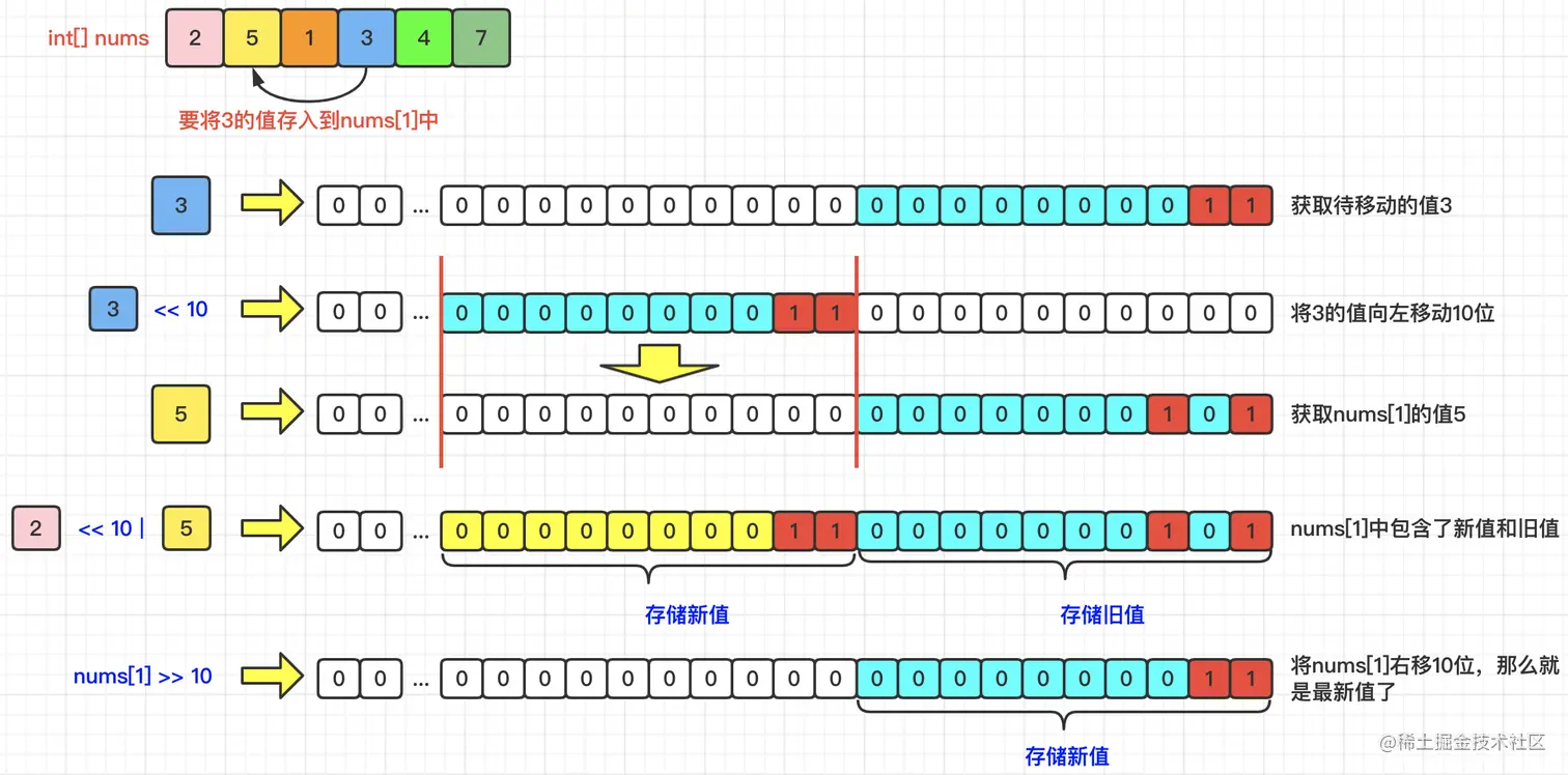 我们举例,要将nums[3]的值赋值到nums[1]的位置上。那么,首先获得nums[3]的值,因为该值要作为新的值,后续要放到nums[1]的第19至第10位上,所以,我们先将其向左移动10位,那么,它就处于第19位至第10位了。然后,我们再将其与nums[1]的值进行按位或(|)操作。那么最终nums[1]位置上的结果就是一个包含了新值和旧值的结果了。当所有元素都迁移完毕后,我们最终需要的还是新值,那怎么获取到呢?其实方法很简单,只需要将nums数组中每个元素都向右移动10位就可以了。具体操作如下图所示: