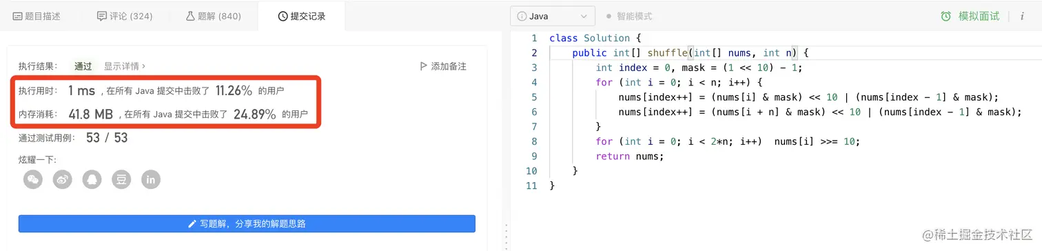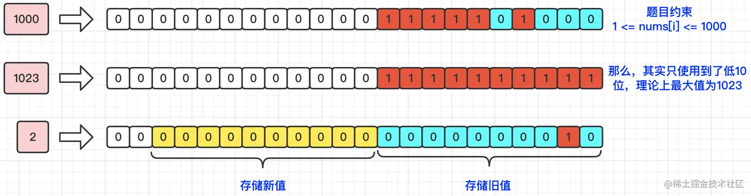 上面思路1中我们创建了一个新的数组,所以它的空间复杂度是O(n),那我们有没有一种方式,不去创建这个新的数组呢?使得空间复杂度为O(1)呢?其实是可以的。通过题目描述,我们可以知道数组中元素值的范围是:1 <= nums[i] <= 10^3。 那么最大值也就是1000了,将其转换为2进制为1111101000,只占了总共32位中的低10位。那么理论上,低10位如果都是1的话,值为1023,我们要是想获得某32位中低10位的值,就可以通过按位与(&)1023来获得了。那既然旧值只使用了低10位,还有22位是空闲的,所以,我们就将第19~10位作为新值的存储位置(下图黄色部分)。具体逻辑,如下图所示: