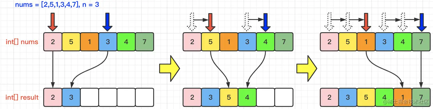 根据题目描述,我们很容易想到通过创建一个新的数组,然后再将旧的数组中的元素,按照一定的规律,迁移到新的数组即可。那么题目中给出的数组长度是2 * n,那么要求最终的数据是nums[0],nums[n],nums[1],nums[n+1],……,所以我们只需要遍历数组nums长度的一半,即:n的长度就可以了。如下图中的红蓝两个指针,红色指针为i,那么蓝色指针为i+n,然后依次将获取到的数据保存到新的数组即可。具体操作如下图所示: