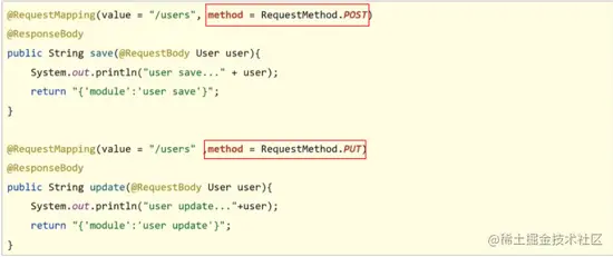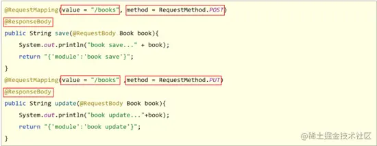 @Controller public class UserController { @RequestMapping("/save") @ResponseBody public String save(@RequestBody User user) { System.out.println("user save..."+user); return "{'module':'user save'}"; } @RequestMapping("/delete") @ResponseBody public String delete(Integer id) { System.out.println("user delete..." + id); return "{'module':'user delete'}"; } @RequestMapping("/update") @ResponseBody public String update(@RequestBody User user) { System.out.println("user update..." + user); return "{'module':'user update'}"; } @RequestMapping("/getById") @ResponseBody public String getById(Integer id) { System.out.println("user getById..." + id); return "{'module':'user getById'}"; } @RequestMapping("/findAll") @ResponseBody public String getAll() { System.out.println("user getAll..."); return "{'module':'user getAll'}"; } } @Controller public class BookController { @RequestMapping(value = "/books",method = RequestMethod.POST) @ResponseBody public String save(@RequestBody Book book){ System.out.println("book save..." + book); return "{'module':'book save'}"; } @RequestMapping(value = "/books/{id}",method = RequestMethod.DELETE) @ResponseBody public String delete(@PathVariable Integer id){ System.out.println("book delete..." + id); return "{'module':'book delete'}"; } @RequestMapping(value = "/books",method = RequestMethod.PUT) @ResponseBody public String update(@RequestBody Book book){ System.out.println("book update..." + book); return "{'module':'book update'}"; } @RequestMapping(value = "/books/{id}",method = RequestMethod.GET) @ResponseBody public String getById(@PathVariable Integer id){ System.out.println("book getById..." + id); return "{'module':'book getById'}"; } @RequestMapping(value = "/books",method = RequestMethod.GET) @ResponseBody public String getAll(){ System.out.println("book getAll..."); return "{'module':'book getAll'}"; } }