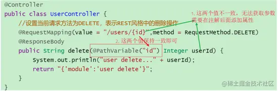 /users/{id},目的是和路径匹配 - 在方法的形参前添加@PathVariable注解