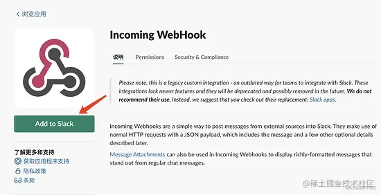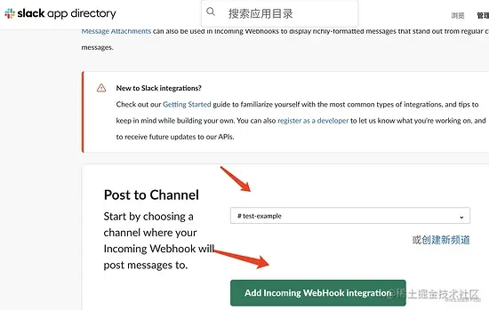 - 工作区添加应用 Incoming WebHook ,选择频道,保存Webhook URL,后面将通过Webhook实现程序往频道中发消息。