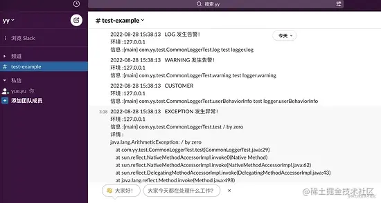测试结果,频道中出现打印的异常信息,方便开发运维人员定位