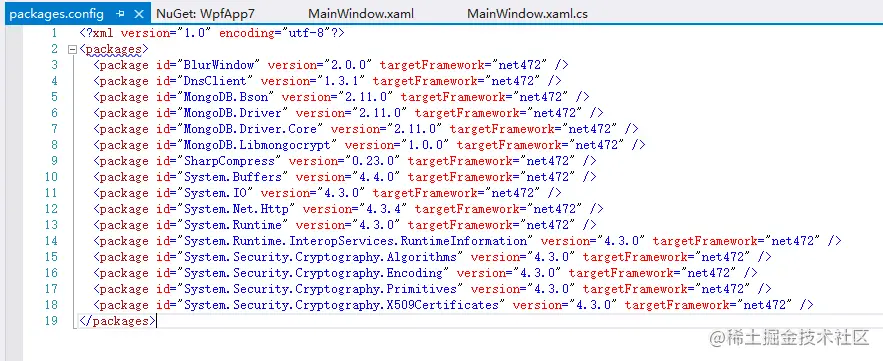 在.Net Framework中,Nuget包引用是通过packages.config文件来记录,且会在文件中列出每一个引用的组件