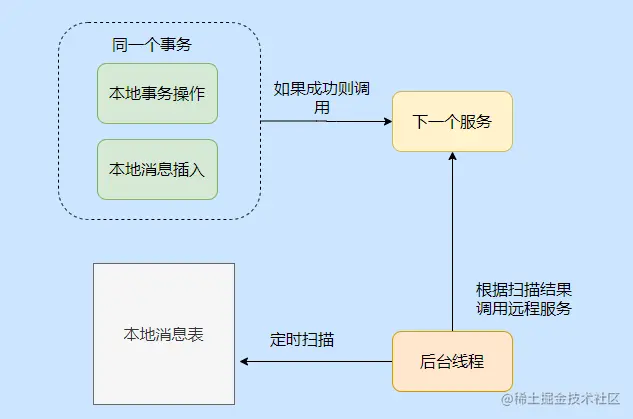 这样本地事务执行成功的话,消息肯定也插入成功,然后再调用其他服务,如果其他服务调用成功就修改这条本地消息的状态。