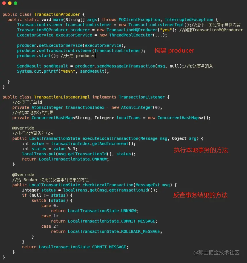 贴一下完整的使用 RocketMQ 事务消息的代码: