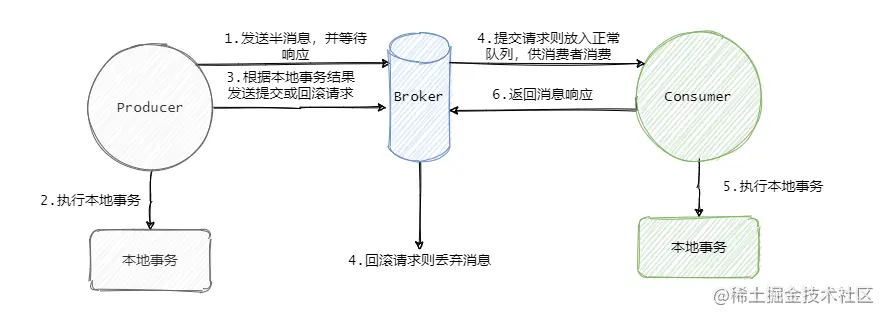 第一步是需要等待半消息的响应,如果响应失败就无法执行本地事务。