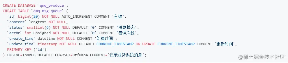 首先,想要用 qmq 的事务消息,需要在数据库中建一张表,就是如下这样的表: