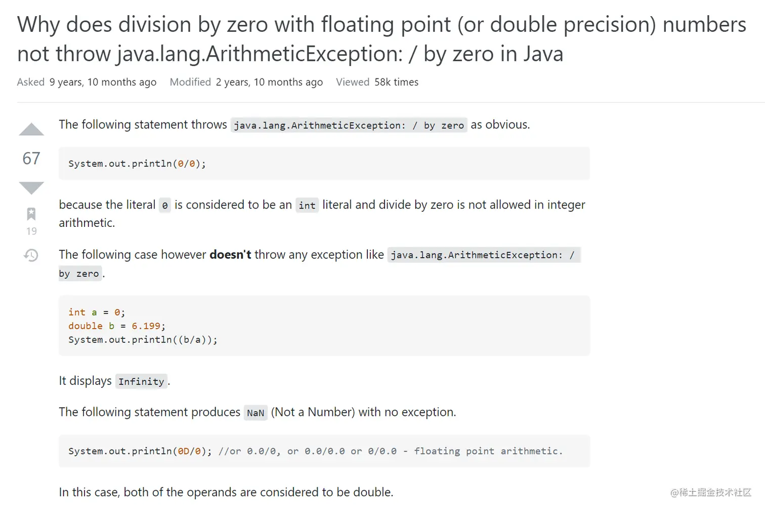 看完之后,你只需要记住一句话:在 Java 里面,除数作为 0,不一定会抛出 ArithmeticException,千万不要形成这样的固化思维,从而影响自己排除问题的方向。