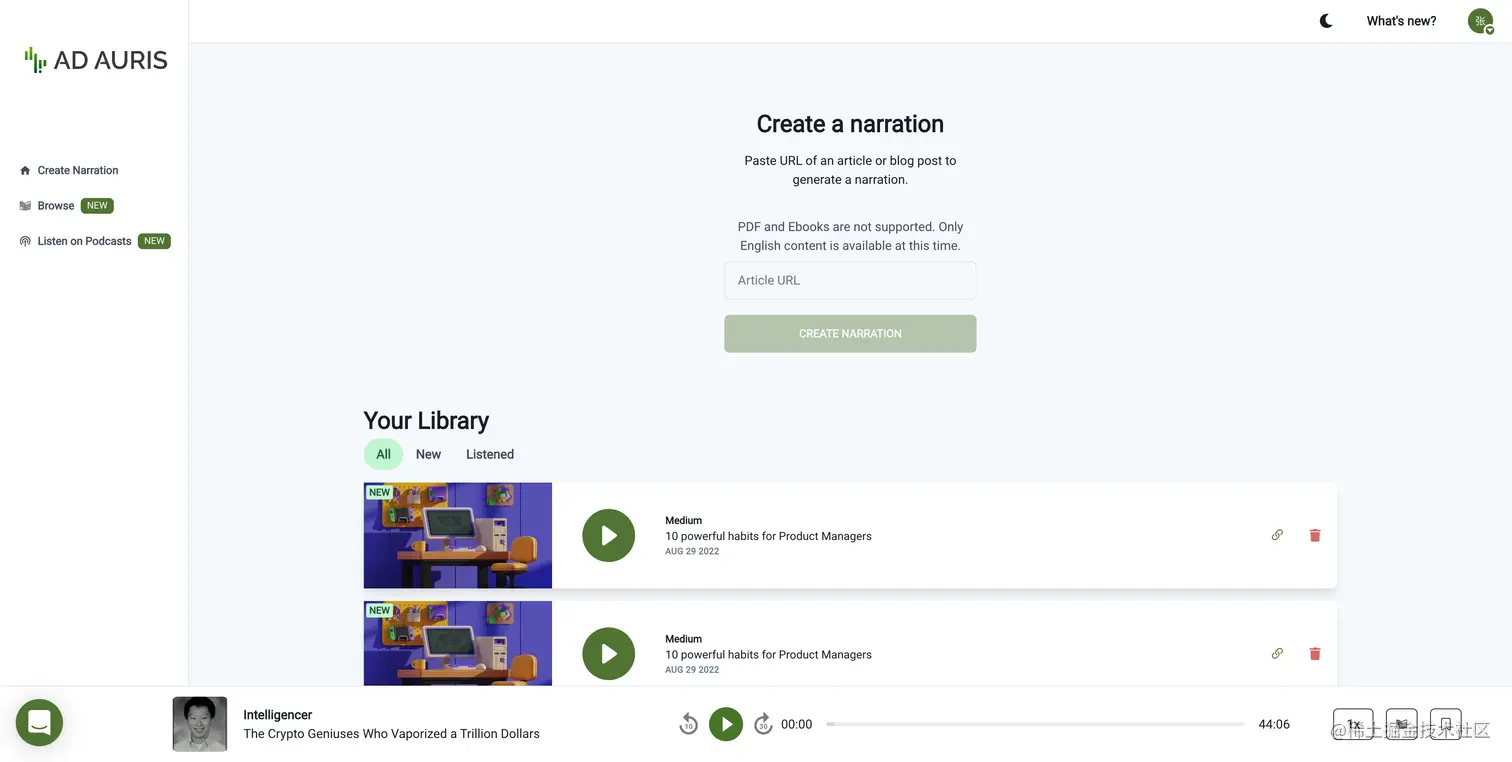 - AD AURIS - 这个网站可以把任何文章转换为音频,然后会自动创建播放列表然后和 Spotify 等播客工具同步收听。之前有推荐过类似的服务,想法还是有需求的。