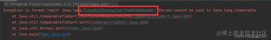 在系统的排序的方法中会将数组类型强制转换为Comparable,但我们的Person未实现Comparable接口,所以会报类转换异常.