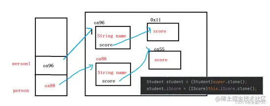 我们发现,两个对象指向了同一块Score,所以我们要将Score也进行克隆.