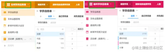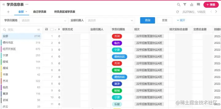 公司根据招生老师的日常工作习惯,选择表格、看板、日历等视图展示数据,方便老师操作。再按照学员的归属地、学费状态、负责区域内的学员、业绩归属人等筛选条件,对学员信息进行统计和展示。招生老师想从哪些维度查看学员信息,直接点击对应视图即可。