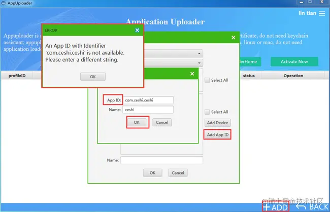 2、点击右下角+ADD,先选择添加Add appid 应用标识符、输入appid,格式是com.com.com这样子的,中间有两个点。 像我开始输入的com.ceshi.ceshi出现错误提示,格式虽然没错,但有报错,尝试修改下不报错就行了。 后面我改下如com.fen.tian,如此就ok,appid在打包ipa时要填写,记好。
