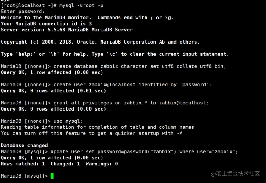 update user set password=password("zabbix") where user="root"; 修改root用户密码\