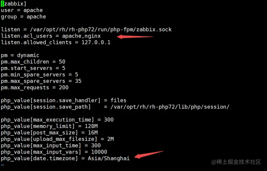编辑配置文件 /etc/opt/rh/rh-php72/php-fpm.d/zabbix.conf\