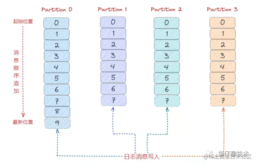 根据上面的存储架构剖析,我们知道 kafka 消息是按主题 Topic 为基础单位归类的,各个 Topic 在逻辑上是独立的,每个 Topic 又可以分为一个或者多个 Partition,每条消息在发送的时候会根据分区规则被追加到指定的分区中,如下图所示: