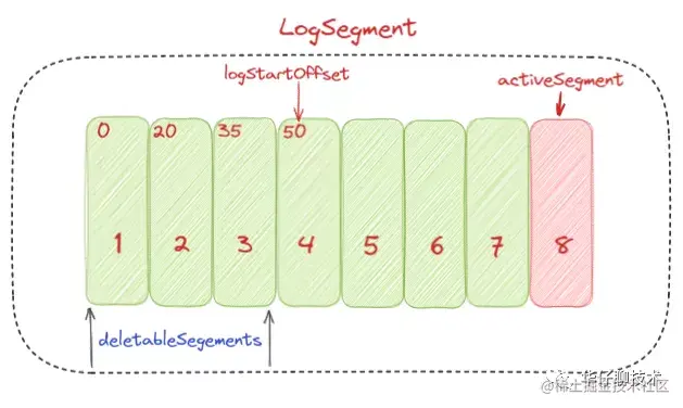 首先从头开始遍历每个日志段,日志段 1 的下一个日志分段的起始偏移量为20,小于logStartOffset的大小,将日志段1加入deletableSegments。