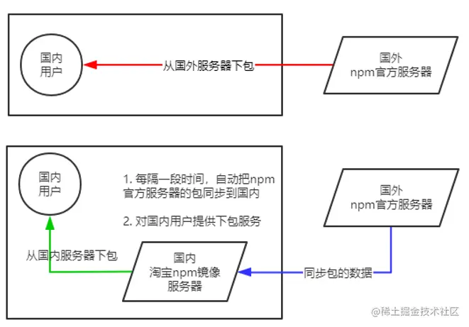 淘宝在国内搭建了一个服务器,专门把国外官方服务器上的包同步到国内的服务器,然后在国内提供下包的服务。从而极大的提高了下包的速度。
