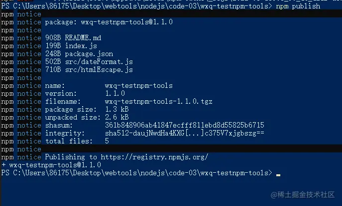 将终端切换到包的根目录之后,运行 npm publish 命令,即可将包发布到 npm 上(注意:包名不能雷同)。