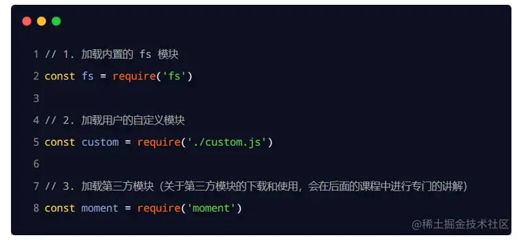 使用强大的 ==require()== 方法,可以加载需要的内置模块、用户自定义模块、第三方模块进行使用。例如: