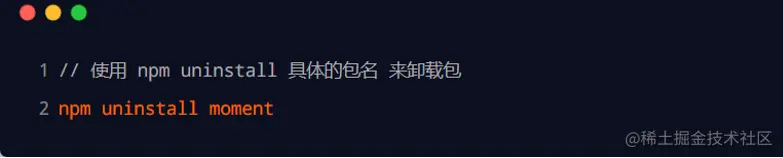 可以运行 npm uninstall 命令,来卸载指定的包: