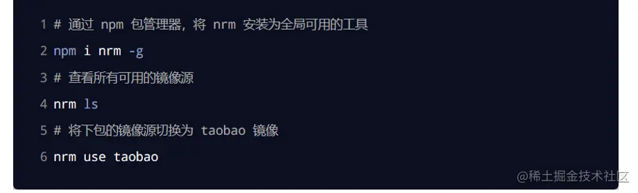 为了更方便的切换下包的镜像源,我们可以安装 nrm 这个小工具,利用 nrm 提供的终端命令,可以快速查看和切换下包的镜像源。