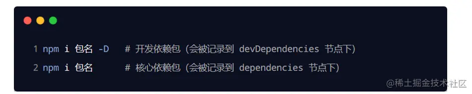 如果某些包只在项目开发阶段会用到,在项目上线之后不会用到,则建议把这些包记录到 devDependencies 节点中。 与之对应的,如果某些包在开发和项目上线之后都需要用到,则建议把这些包记录到 dependencies 节点中。