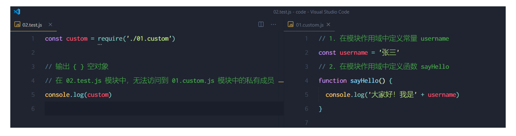 和函数作用域类似,在自定义模块中定义的变量、方法等成员,只能在当前模块内被访问,这种模块级别的访问限制,叫做模块作用域。