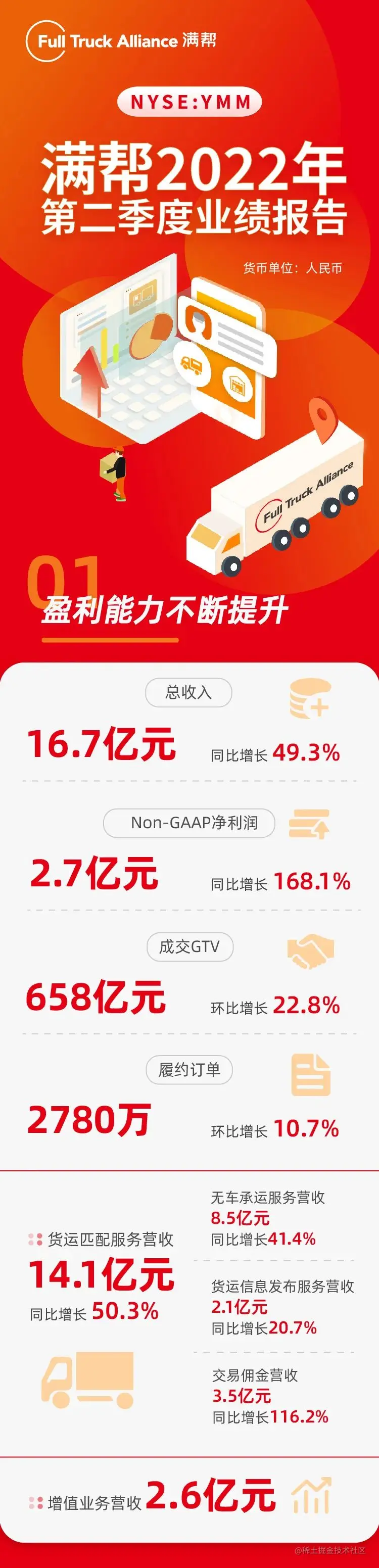 2022年第二季度,满帮实现营收16.7亿元,同比增长49.3%,超过Q1财报披露时给出的16.4亿元预期上限。另外,满帮实现Non-GAAP净利润2.7亿元,同比大幅增长168.1%。