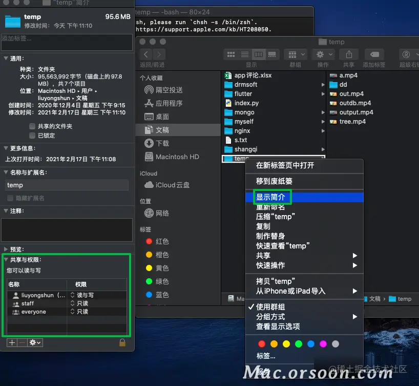 我们可以通过右键 -> 显示简介 -> 共享与权限来查看我们当前登陆的用户是否有写的权限。如果没有那么只要给上读写权限即可。