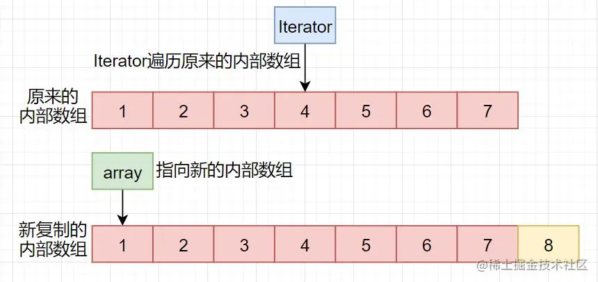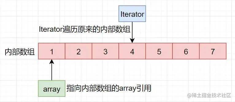 当进行操作时,都是基于array指向的这个内部数组进行的。例如,我们使用Iterator迭代器遍历这个数组时,会按照下图所示的方式进行读操作。