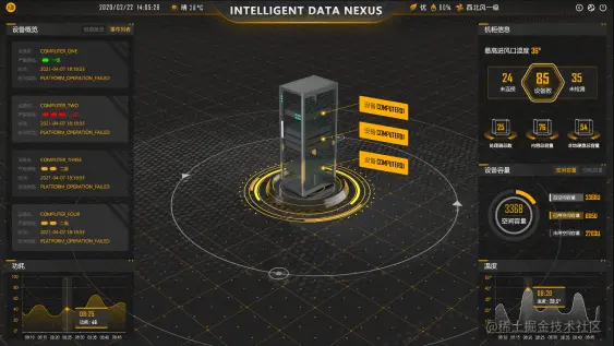 设备管理模块利用3D技术制作了机柜三维模型,并对机柜内部情况进行了展示,包括机柜信息、设备分析、CPU分析以及内存分析。