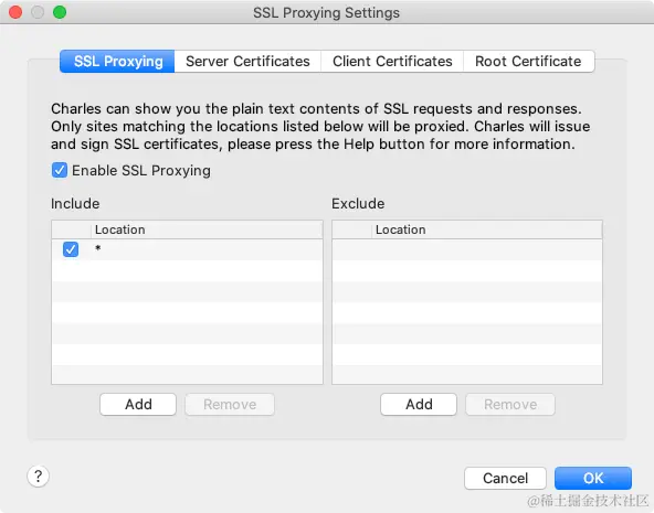 - 获取证书:在浏览器访问“chls.pro/ssl” 下载证书,并在 Proxy->SSL Proxying Settings->SSL Proxying,在 Include 中点击 Add,并在 host 处填写*,同时点击 Enable SSL Proxying。然后选择 OK: