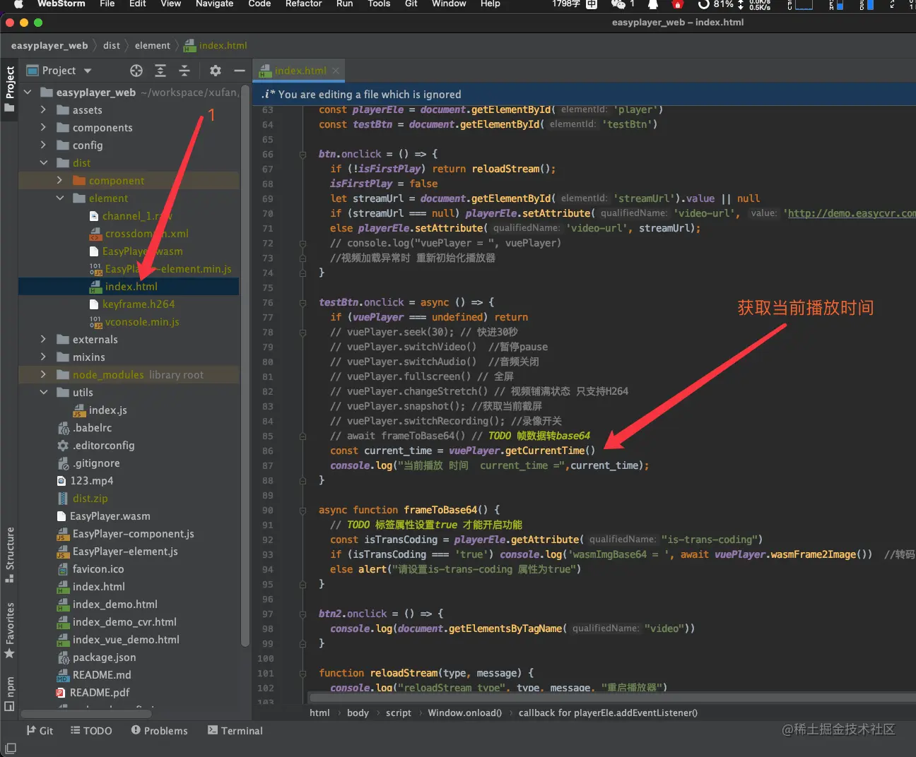 在index.html打开,如图所示位置,可获取到当前播放时间: