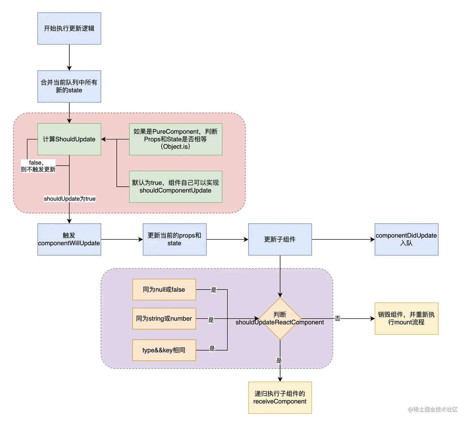 shouldComponentUpdate方法来决定是否重新render,另外对于PureComponent来说,这里通过shallowEqual来判断state和props是否发生了变化,主要利用的是Object.is判断是否相等。